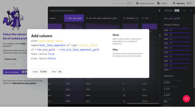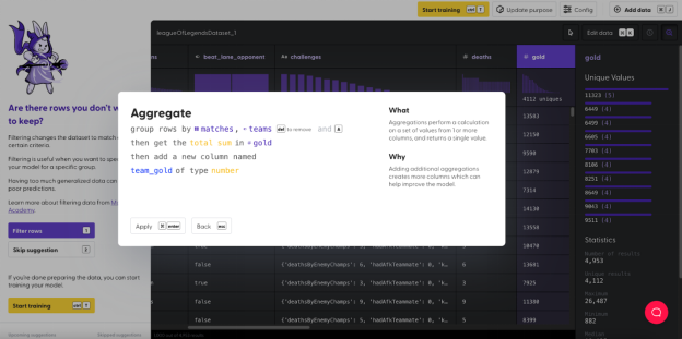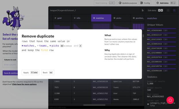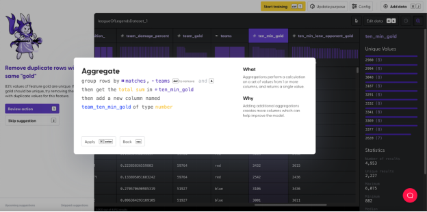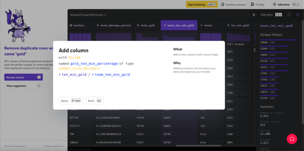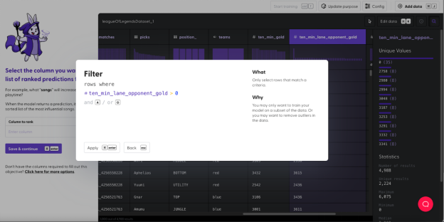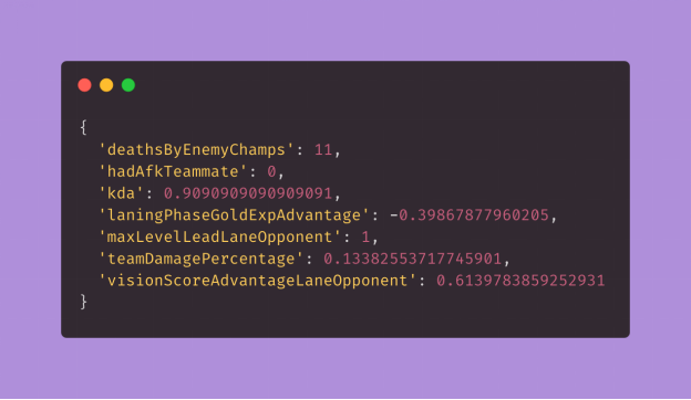 大多数数据科学家都知道,优秀的模型源自强力且适合的数据集。为了撰写这篇指南,我们费了九牛二虎之力解析了拳头游戏 API 返回的结果,并谨慎地选择了一组白金与钻石级别的游戏数据,其中包含 5000 多行 14 列的数据。