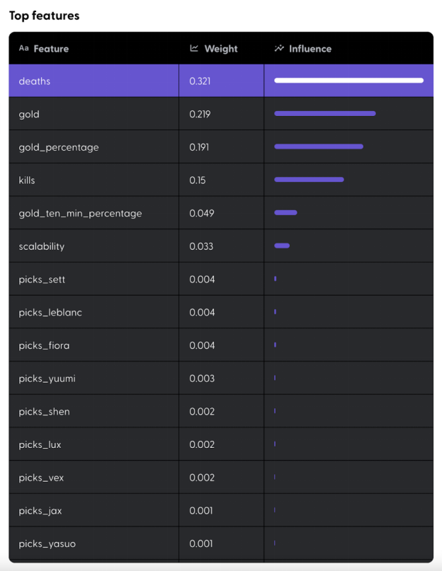 通过顶级特征列表,我们还可以看出哪些列对预测结果基本没有影响。既然“bans”(禁用英雄)、“beat_lane_opponent”(击败对线对手)和“team_damage_percentage”(团队伤害比例)并没有出现在上述列表中,我们可以在重新训练的时候排除这些列,从而改进我们的排名模型。