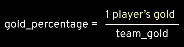 下面,我们需要一些数学演算。主要的评估因素是与团队成员相比,你的金币贡献率是多少,我们称之为“gold percentage”(金币比例),计算公式如下:
