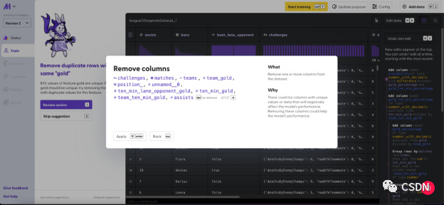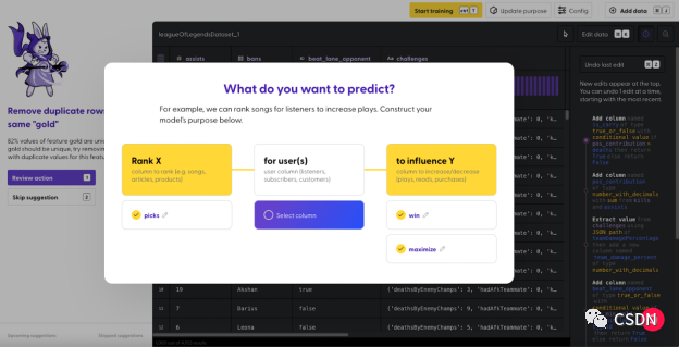 训练模型指的是,模型接收我们精心加工过的数据,然后分割出一批数据,学习如何预测当玩家选择某个英雄并达成特定目标后能否赢得比赛。