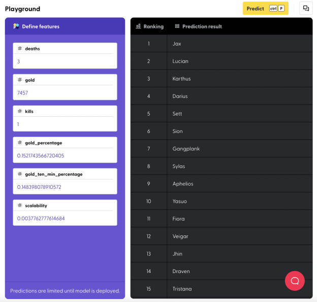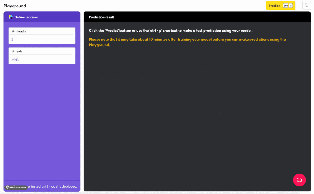 如果你很好奇一定的金币数量和死亡次数是否会影响获取机率,可以尝试在页面“Predict > Playground”中部署这个 API,并自定义预测。