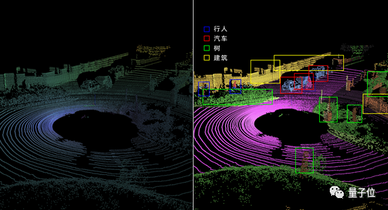 △ 左为原始点云,右为语义分割点云,清晰识别人、车、树等物体