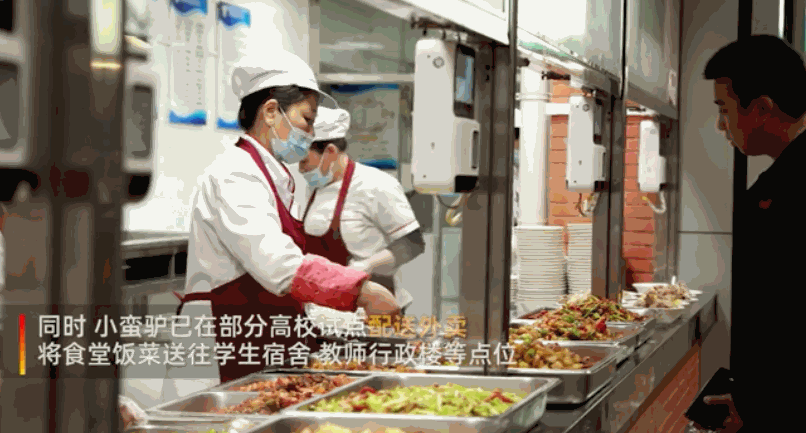 最近,四川、浙江等地就有学校响应疫情防控政策,引进小蛮驴在校内配送外卖,也就是把食堂的饭菜送到学生宿舍楼、教师行政楼等等,减少人与人之间的接触。