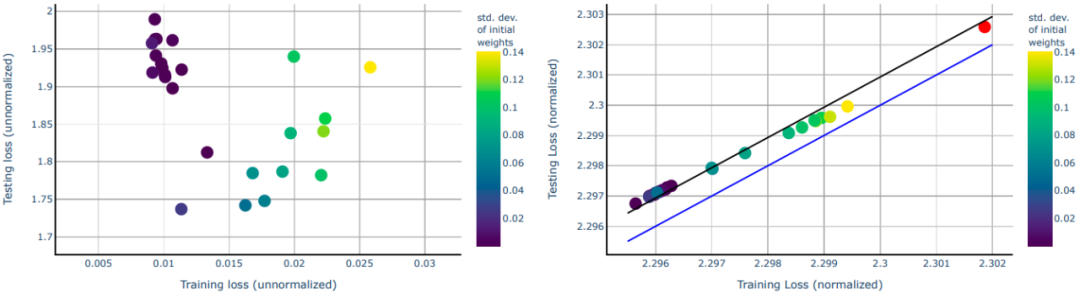 左图显示了在数据集(CIFAR-10)相同、初始化不同的网络上,测试与训练交叉熵损失的对比,结果显示在训练集上产生的分类误差为零,但测试误差不同;右图显示了在相同的数据、相同的网络上测试与训练损失的对比。