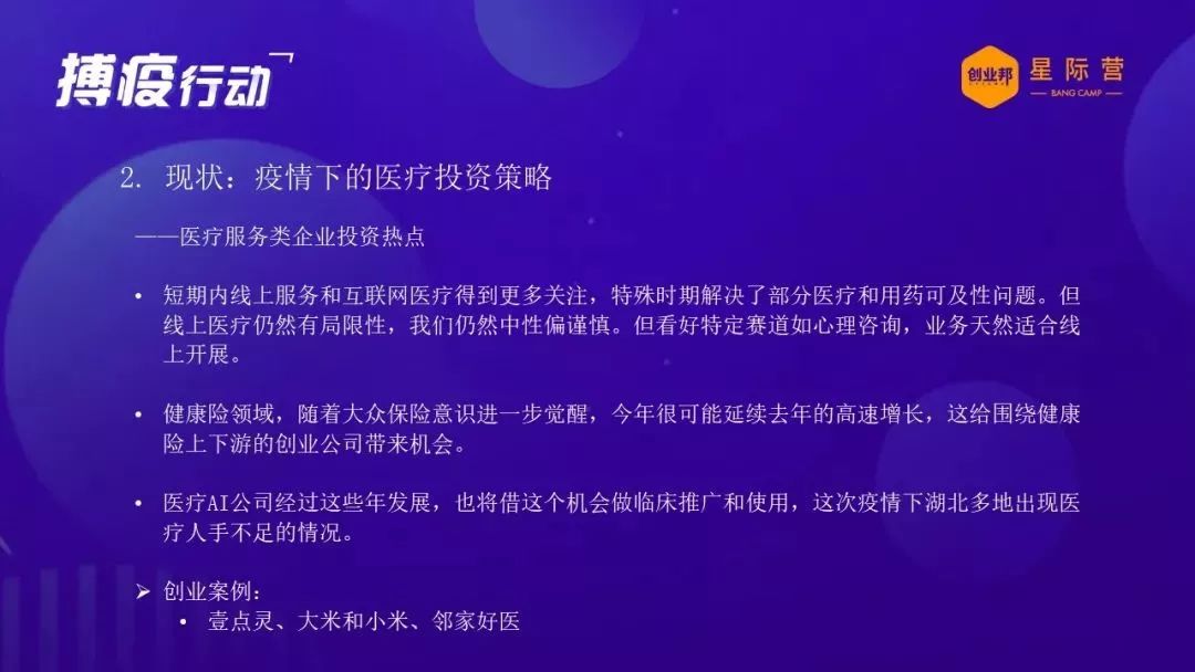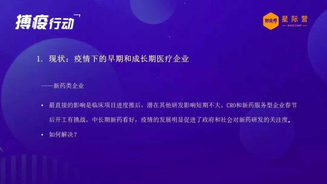 所以我觉得我们很多医疗医药的创业企业可以坚定在这方面的信心,继续在这个里面做好我们该做的事情,投资机构也会继续在这里面长期的耕耘。那么可能非医疗医药的创业企业,我个人觉得可能现在要转型做医疗医药创业企业有难度,但是可能刚才提到的一些医疗医药企业的一些把握机会的方向,或者去应付危机的一些措施手段,可能也对你们也是有帮助的,可以从长远的角度来考虑。