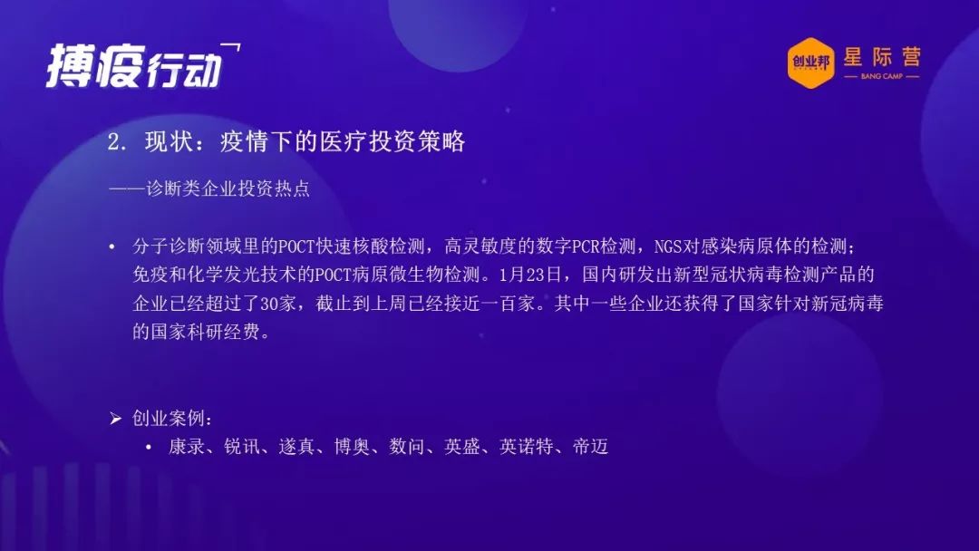如果将来有好的医疗技术,能尽量去减少感染,这样那么通过机器人或者通过AI的手段,能进行很多的筛查、诊断,或者说做一些基础的工作,那么我相信这个也是会很有前途的,也会引起投资人来关注的。以上的观点可能代表了一部分的投资机构,但是我相信还是比较有代表性的。