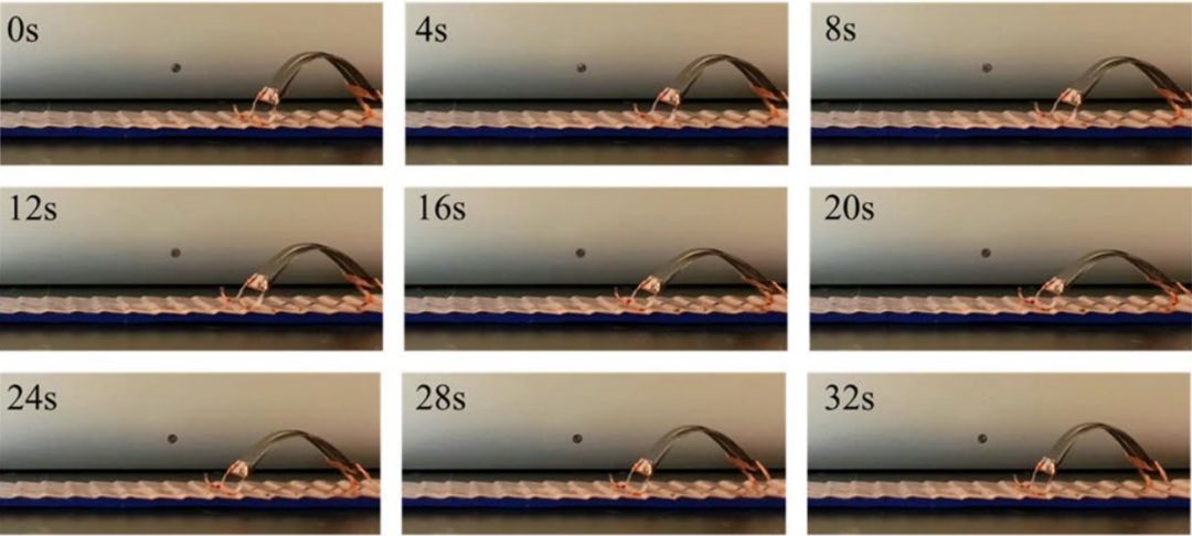 多伦多大学 “材料科学工程部” 的Hani Naguib教授及其小组提出了一种新型的智能材料并制造了一只软体机器人“尺蠖”(读音huo)。这个机器人的外表平平无奇,看起来如同一片黑色的胶带,有着四只铜脚。但你可不能小瞧它,借助神奇的“智能材料”技术,间断性的通电就可以实现尺蠖的爬行运动!
