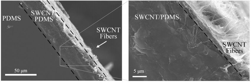 如图3,该研究中提出的新型的ETA是将PDMS(Polydimethylsiloxane,聚二甲基矽氧烷)层和SWCNT(single-wall carbon nanotubes,单层碳纳米管)层通过特殊的制造方法(详请可参考文末原文链接)融合。
