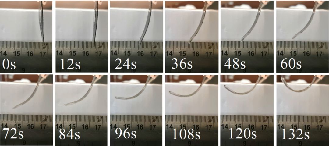 图中展示了ETA驱动器在通电加热的情况下,随着时间的变换,驱动器弯曲的变化。