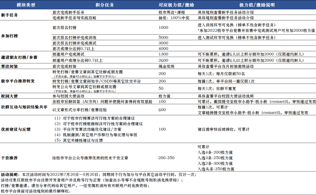 成为极市平台用户,首次报名打榜即可领取极力值!首次报名打榜、完成训练、测试,完成打榜不同环节分别能领取相应极力值!2022年报名参加极市平台竞赛活动的朋友,报名打榜并完成训练还可额外领取2000极力值。