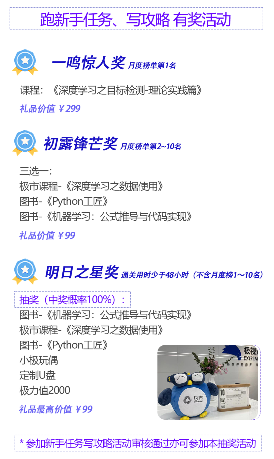 活动期间,在极市社区发文投稿分享您的新手任务实战攻略,合乎要求即可获得抽奖资格!