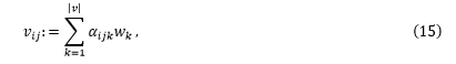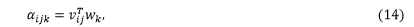 其中Wk表示静态单词记忆We中的第k行向量。Vij和Wk都先进行了归一化操作,因此αijk等价于cosine相似度。接下来区域特征Vij可以用记忆当中所有单词向量的加权和表示,如公式(15)所示。