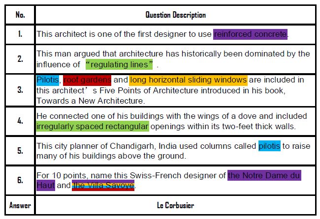 给定一段描述性语句,仿真型问答旨在提取实体答案。单句问题[33][34]是FQA中最常见的形式。例如:“世界上最大的大陆是什么?”。另一方面,还有另一种形式的FQA,其问题是描述某个实体的描述性段落。这种FQA的一个典型例子叫做QuizBowl[35][36]。Quiz Bowl问题由一系列有序句子组成,这些句子从不同角度描述了答案的方方面面。它有一个名为“金字塔”的属性,意味着先前描述问题的句子包含更隐蔽的线索,而之后的句子会给出较为具体的信息。图7展示了一个Quiz Bowl问题及其相应答案的示例。具有相同颜色的单词与答案具有相同的指示性提示(例如,Notre Dame du Haut和Villa Savoye是Le Corbusier使用钢筋混凝土框架设计的两座建筑。)。这个问题包含六个有序句子。前面的句子包含答案信息较少,后面的句子提供了更有用的线索来揭示答案。