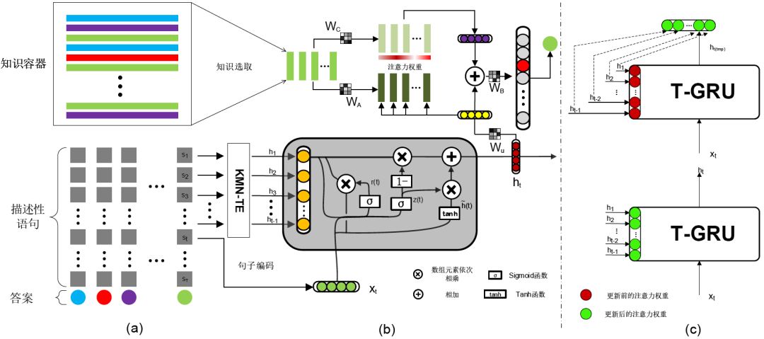 图8是文献[43]提出的时序增强知识存储网络(TE-KMN)结构图,其中,(a)左下角是训练数据。对于每个答案,有几个有序的描述性句子从不同方面逐渐揭示一个答案。靠前的句子包含较少与答案相关的线索,而后序语句则包含较多线索。左上角是一个知识存储器,由外部辅助知识组成,这里的知识主要来自维基百科。(b)给出答案,假设总共有T个有序句子从不同方面描述答案(即 S1,S2……ST)。每个句子Si都被编码为向量Xi。每个句子ht的隐向量hi(1≤𝑖≤𝑡−1)将影响隐向量ht的学习。隐向量ht之后被传送到知识存储网络,并与句子st相关的外部辅助知识做进一步推理。(c)更新T-GRU的注意力机制。右上角是更新前的T-GRU。右下角是同一个T-GRU,h1, h2 ,..., ht-1是读取前面句子的T-GRU的隐藏输出。红色和绿色实心圆圈分别代表更新前后的α值。