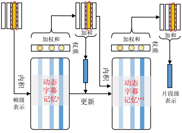 该模块的主要目的是通过动态字幕记忆得到电影片段中特定帧的语义表示。因为电影不仅包含视觉内容还包含字幕信息,因此,文献[51]提出了动态字幕记忆模块来表示带有电影字幕的电影片段,其框架如图11所示。