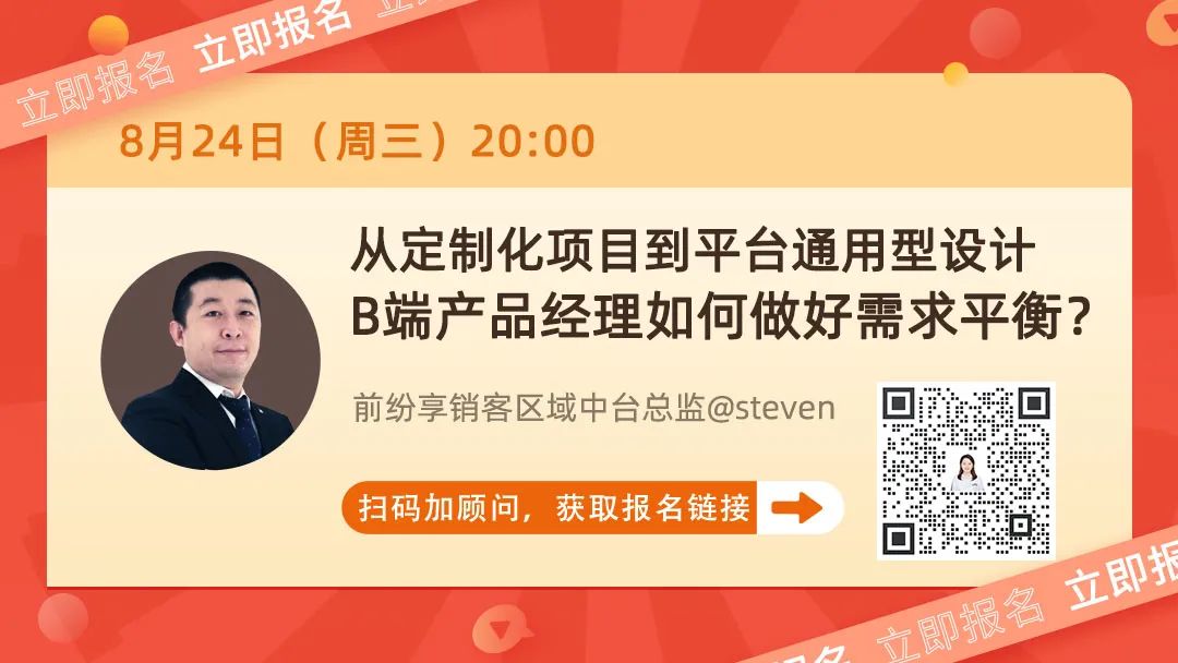 8月24日(周三)晚8点,前纷享销客区域中台总监@Steven老师 手把手教你破解B端产品设计3大难题。