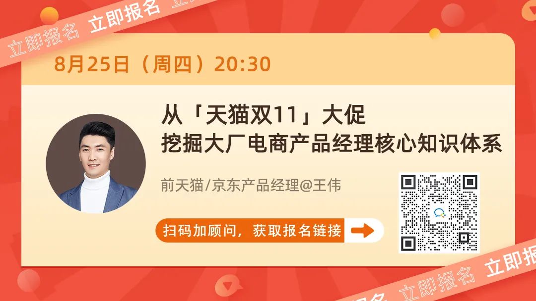 8月25日(周四)晚8点半,前天猫/京东产品经理、《电商产品经理》作者@王伟,将以天猫双11案例,解析大厂电商产品经理的核心知识体系,助你系统入门电商产品经理!