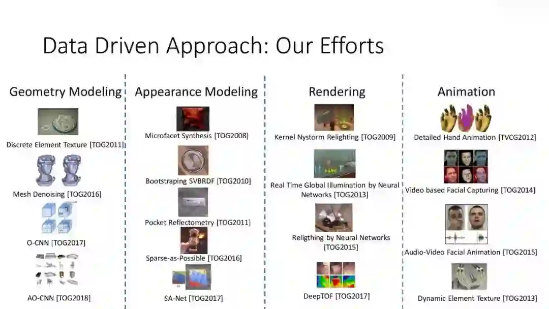 在过去几年,我们组在 data-driven approach 方面做了一系列研究工作,结合自己和同行们的探索渐渐总结出了一些思路。下面我们先做个考古,看看在深度学习出现之前数据驱动的图形学研究,然后再讲深度学习和图形学结合面临的挑战和我们的探索;最后展望未来这一领域中还存在哪些问题和挑战。