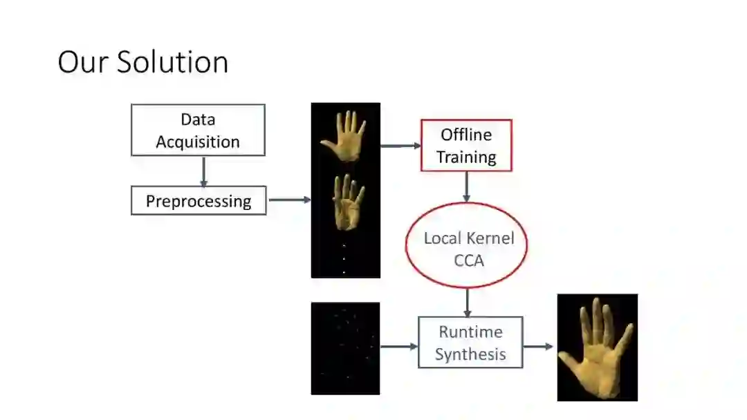 在这个工作[2]中,给定少量的不同手部姿势的三维扫描结果,我们希望能够推导出这只手在所有可能姿势下的动画效果,同时生成手部表面所有的细节。这非常有挑战性,原因有二:第一,手有21个关节,变形的自由度非常高;第二,随着手的变化,褶皱细节的变化也很丰富。但是我们有的数据只包含十几个或二十几个手的姿势。