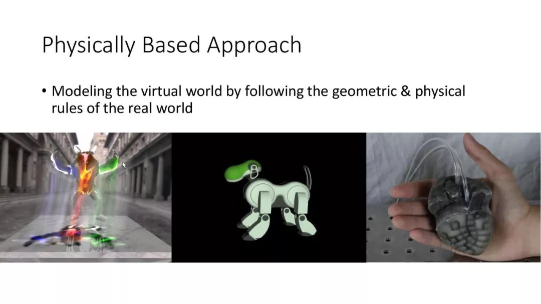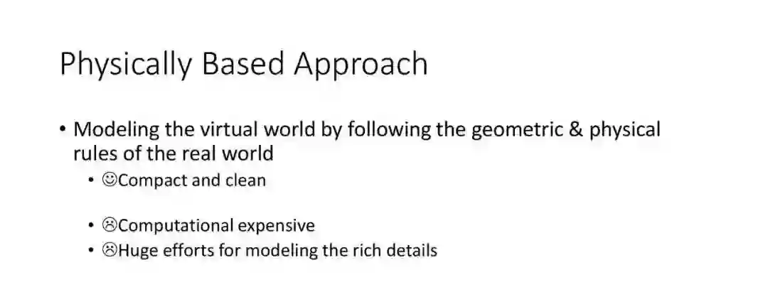 因为真实世界是三维的,很自然的我们可以按照真实世界的物理规律去在计算机中进行建模和模拟,这样产生了基于物理的方法。这个方法构建了图形学研究的基石,能对图形对象进行很好的建模和模拟,但是仍有一些缺点。第一,一个简洁的物理公式可以描述非常多的现象,但当用一个简单的物理公式去描述真实世界中所有这些细节的时候,导致过程复杂和庞大的计算量。第二,当艺术家想创造一些完全属于想象中的虚拟世界时候,如何放宽这些物理限制,同时还能生成看起来合理的非常漂亮的图像,就变成了一个很大的挑战。