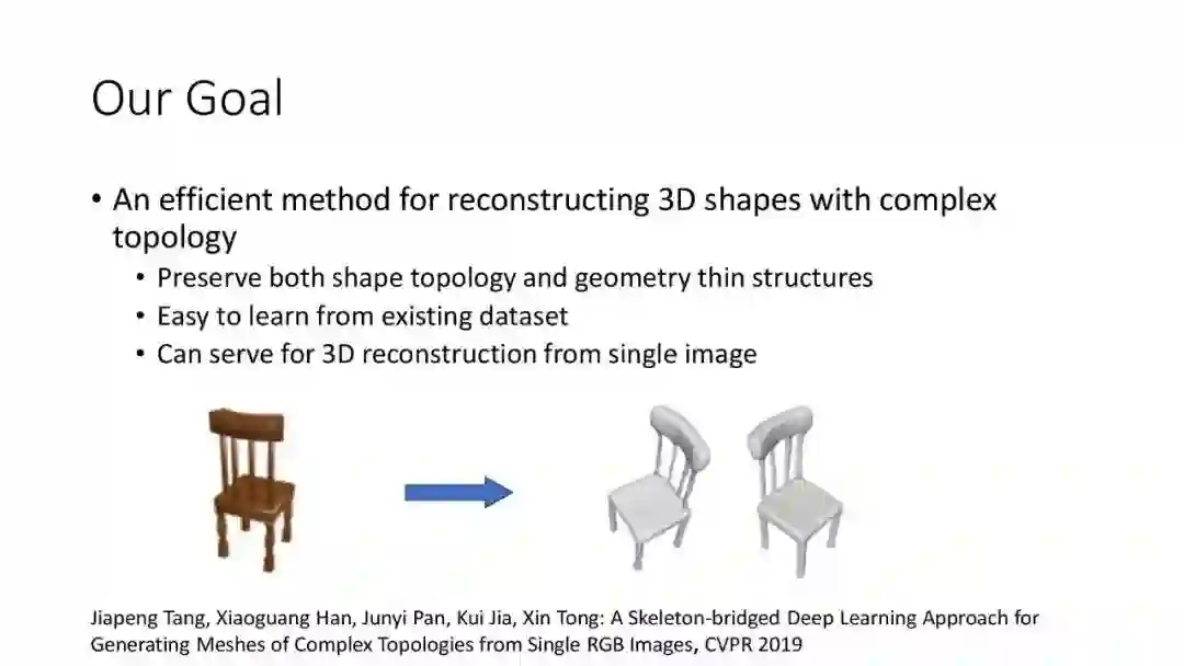5. Jiapeng Tang, Xiaoguang Han, Junyi Pan, Kui Jia, Xin Tong: A Skeleton-bridged Deep Learning Approach for Generating Meshes of Complex Topologies from Single RGB Images, CVPR 2019