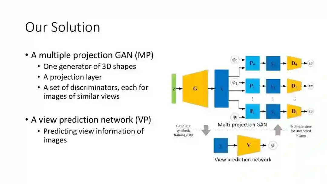 为了解决这些挑战,我们设计了两个模块。第一个是 Multiple Projection GAN。我们先假设每张图像的视角已知,把所有输入图像根据视角分类,然后对每个视角类训练一个鉴别器。我们训练一个生成器来生成 3D 形状,然后把它投影到不同视角上,再通过这个视角下的鉴别器比较和这个视角的图像是否一致。但图像视角是未知的,所以第二个模块就是视角预测网络。这样我们先从生成器得到 3D 形状作为视角预测网络的训练数据,训练好的视角预测网络可以用来预测 2D 图像的视角,从而把 3D 形状生成器训练得更好。这个过程不断迭代进行,就能互相优化提高,得到最终的结果。目前我们的算法利用物体的轮廓线来进行训练。