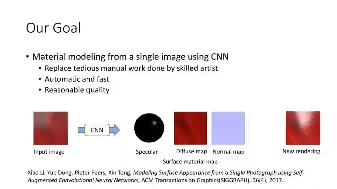 7. Xiao Li, Yue Dong, Pieter Peers, Xin Tong, Modeling Surface Appearance from a Single Photograph using Self-Augmented Convolutional Neural Networks, ACM Transactions on Graphics(SIGGRAPH), 36(4), 2017