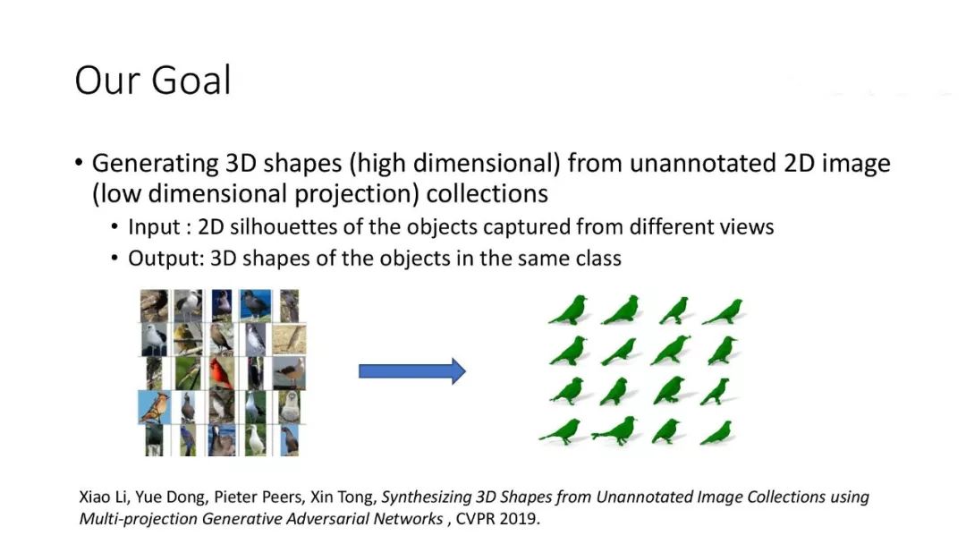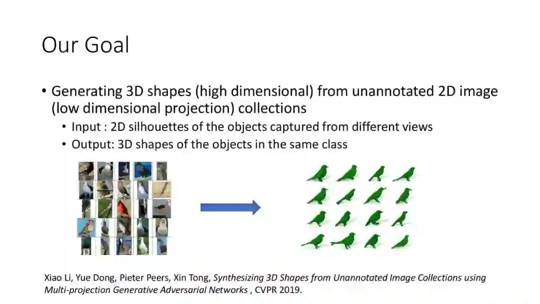 为了解决数据集和数据量的问题,我们希望能够利用大量图片来完成一些三维的学习任务,从而提供解决数据问题的一个新的思路。在今年的 CVPR 2019 工作[6]中,我们提出了一个多投影方法,可以从一类物体的图片集中学习一个三维生成网络,生成此类物体的三维形状。这个问题主要有3个挑战:第一,输入只有 2D 图像,而输出需要是 3D 形状;第二,我们没有输入图像中直接的一致性,或者说没有同一只鸟不同视角的图片,这导致很多传统的多视角重建方法不适用。第三,每张图像的视角信息也是未知的。