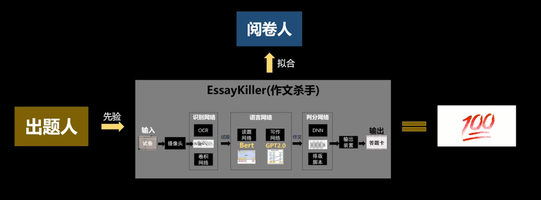 第三部分是判分网络。正常学生写完一篇八百字的高考作文通常需要 40 分钟,而 EssayKiller 只需要 0.1 分钟。