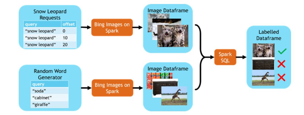 基于 Bing 图片搜索结果的数据集,可以在 Spark 上创建各种应用。以收集雪豹数据集为例,只需要两个 Spark 查询就可以完成数据集收集,其中一个查询收集正样本(雪豹相关的图片),另外一个查询收集负样本(随机图片)。然后,将结果数据集拉取到 Spark 集群,通过 Spark SQL 做预处理,比如:添加标签、删除重复数据等。Spark 在 Azure 集群上并行处理,只需要花费几秒钟的时间就可以通过 Bing 搜索获取到世界各地的上千张图片。然后,通过 MMLSpark 的 OpenCV on Spark 对图片进行快速处理。