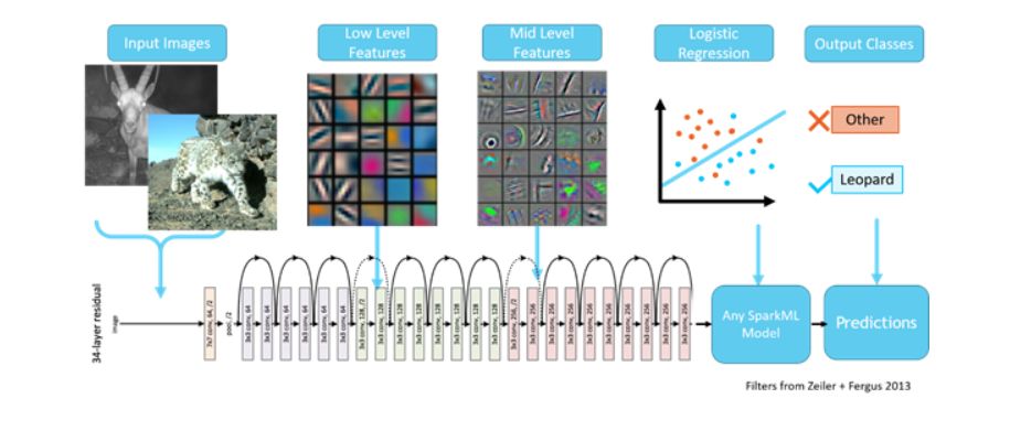 上一步,数据集已经创建完成。下面开始构建模型,卷积神经网络(CNN)是图像处理中比较流行的深度学习网络模型。为了构建深度神经网络,可以借助 MMLSpark 上的 Cognitive Service on Spak(CNTK 深度学习工具)。迁移学习是目前比较流行的解决新任务的技术,MMLSpark 上做迁移学习任务非常容易。现在,对于雪豹物体识别的新任务,你不需要从零开始构建一个全新的网络结构,只需要借助微软预先训练好的模型和借助迁移学习技术就可以解决这一问题。这个物体识别过程非常像人的思考过程是基于历史的记忆,来学习、判断、和识别新事物。通过残差网络在数百万图片上训练的通用深度网络模型,我们现在可以拿来使用,只需要剪切最后几层网路结构并且使用 Spark ML 中的 LR(逻辑回归)做替换,构成新的网路结构。也就是说,将前面几层网络输出的雪豹图片特征,输入到逻辑回归,最后输出的结果是雪豹的概率值。