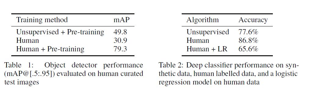 我们发现大多数的图像我们完全无监督的目标检测器绘制的边界框非常接近人类绘制的水平。下图表 1 和表 2 表明,我们的方法可以逼近人类的分类效果和人类的物体识别能力。在物体检测方面,无监督 + 预训练模型的 mAP 值达到 49.8,超过了人类的 30.9,小于人类 + 预训练模型的 mAP 值 79.3。图像分类方面,无监督的精确率为 77.6%,比人类的 86.8% 低,但是,高于人类 +LR(逻辑回归) 的精确率 65.6%。