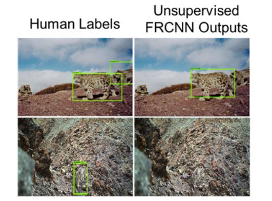 在检测过程中,我们也发现了一些问题,比如下图中:1、图片中真实的雪豹是两只,我们的算法仅仅识别到一只;2、有些雪豹隐蔽性很强,我们的算法没有识别出来。