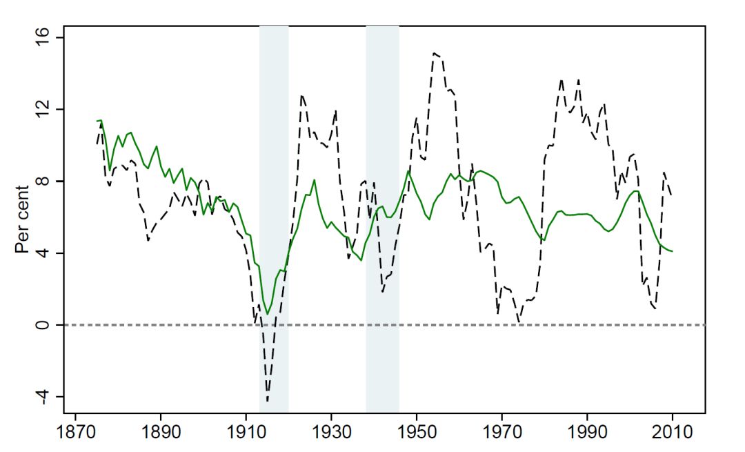 不论是研究收入不平等的经济学家,还是关注投资收益的金融从业者,再或是制定经济政策的政府官员,资本回报率始终是他们眼中最重要的经济指标之一。然而,现有研究对资本长期回报率的测算尚显不足。例如,通常占一国近一半财富的房地产一直未被涵盖。Òscar Jordà, Katharina Knoll, Dmitry Kuvshinov, Moritz Schularick和Alan Taylor 五位学者于2019年合作发表在Quarterly Journal of Economics上的论文 “The Rate of Return on Everything, 1870–2015” 基于全球16个发达经济体横跨150年的经济数据,首次测算了包括房地产在内的主要资产的长期回报率,推进了此领域的研究。