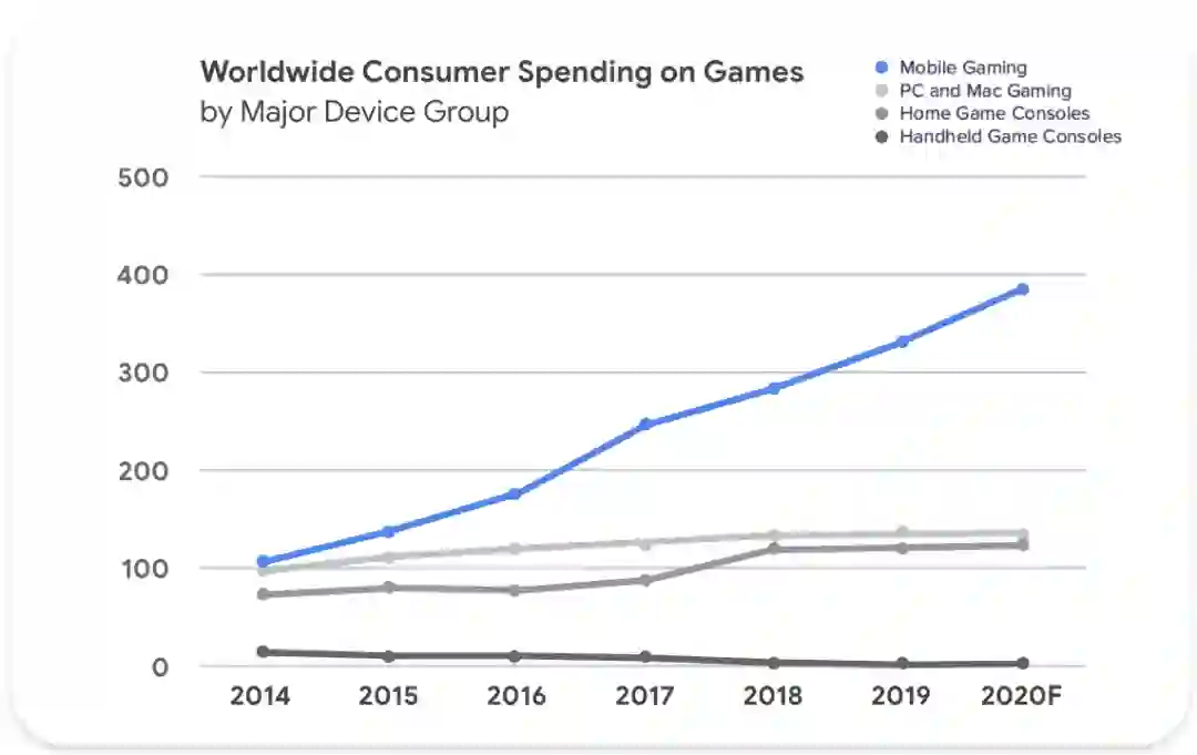 预计到 2020 年底,游戏行业中的移动游戏的消费者支出将持续占据领先地位
