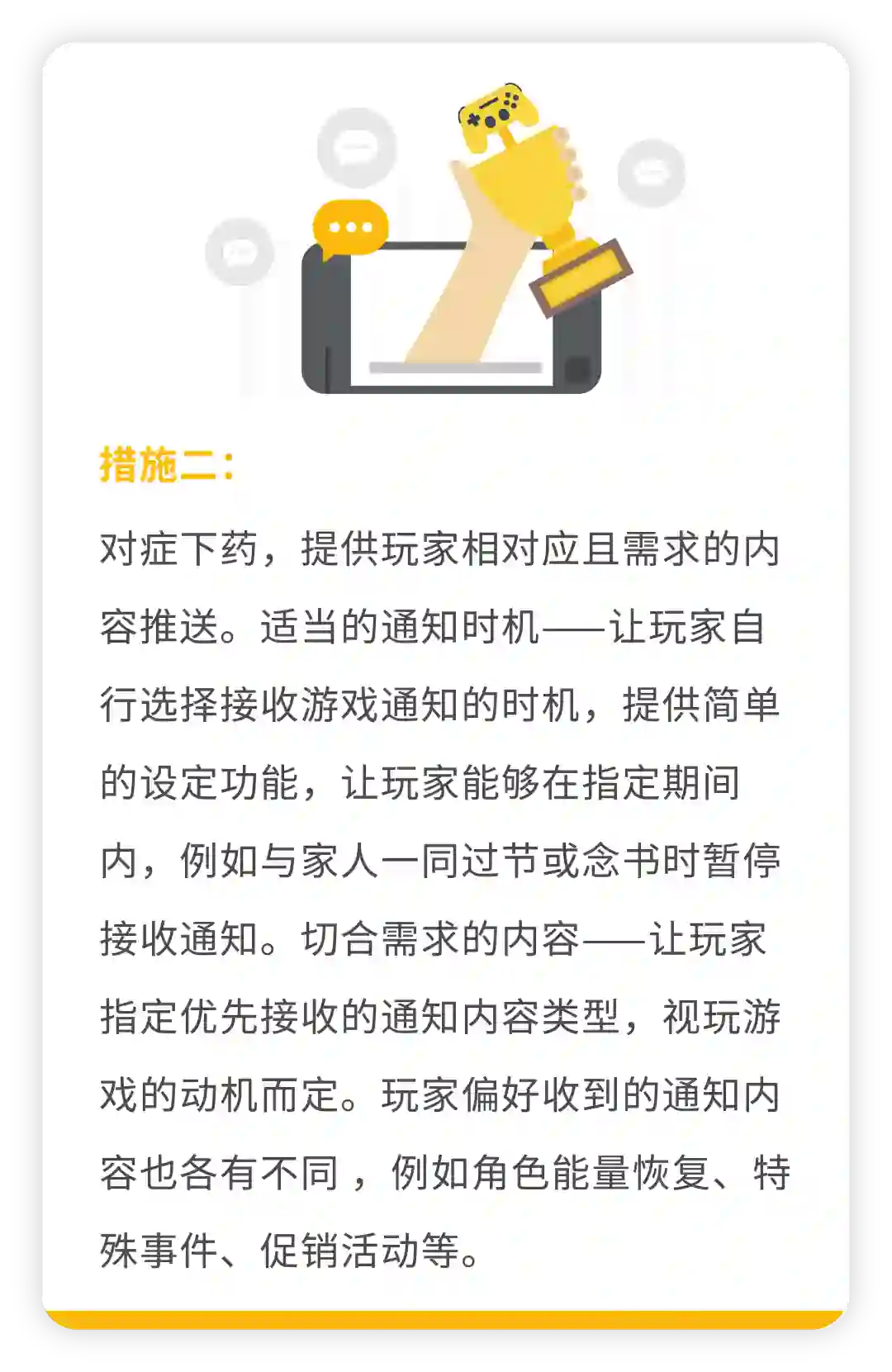 上面提到的 3 种情况虽然不是绝对的,但是在玩家中也占了很大比重。针对这些问题,Play 团队也给出了 3 种应对措施,来提升游戏体验,培养长期忠诚玩家。