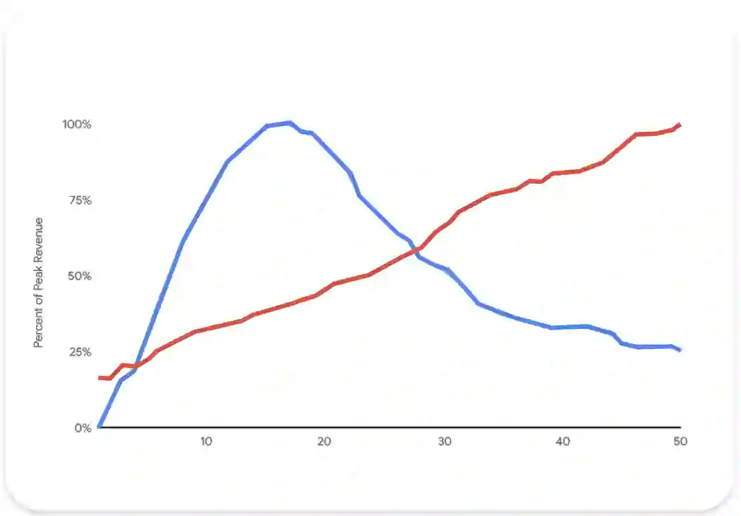 在评估游戏时,开发者应运用哪种思维?是根据市场趋势作出调整的固定式思维还是成长型思维,能够在游戏效果出现下滑时,看到未来继续成长的可能?事实上,当我们考虑到游戏的整个生命周期时会发现,无论营收还是用户留存都会在前期呈现上涨的趋势,达到高峰后逐渐下降。如果真的想让游戏走向与下图红线的方向保持一致,成长型思维是关键。
