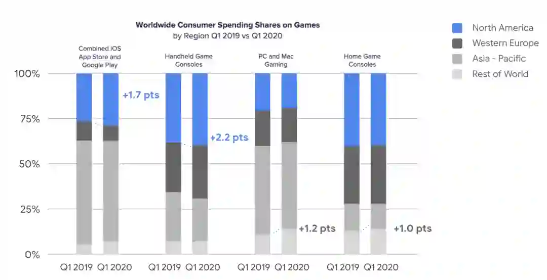 从 2020 上半年趋势看,宅经济在全球或成新常态。智能手机使用量增幅明显。据统计,2020 年第一季度,用户通过智能手机下载应用的数量越来越多。较 2019 年第一季度相比,所用流量增长 34%,用户平均每周在游戏 / app 上的花费增加 20%,约 350 亿小时。