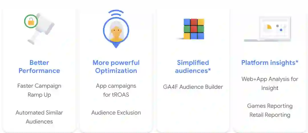 Firebase 除了对现有功能的优化之外,其实也会推出一系列新的功能。Automated Similar Audiences,就是基于 Firebase 的数据自动找到并生成高价值用户的列表。具体使用上,就是在投放 AC 2.5 的时候选用 Firebase 事件作为优化目标,Firebase 的后台会自动利用收集到的第一手数据甄别可能会触发目标事件的用户,将这些用户实时的分享给 Google Ads,从而使机器学习更高效,广告投放更加精准。