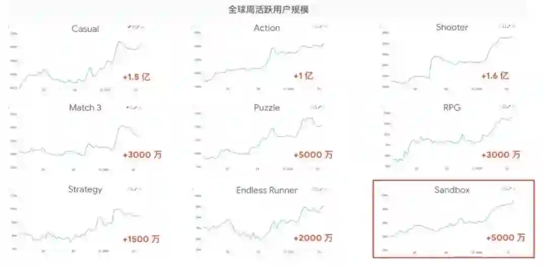 "宅经济" 兴起后,移动游戏与应用的全球活跃用户相较于去年已经有了飞跃式的增长,孕育了巨大的新机遇。以 Health & Fitness 为例,这个曾经逐渐成熟平稳的领域,因为 "宅经济" 影响迎来了新的发展契机。游戏领域亦是如此,2020 年全球周活跃用户规模较上一年增长 10 亿,一系列细分赛道的量级都得到了显著的扩充。相对小众的级别也有跨越式用户量级的提升。