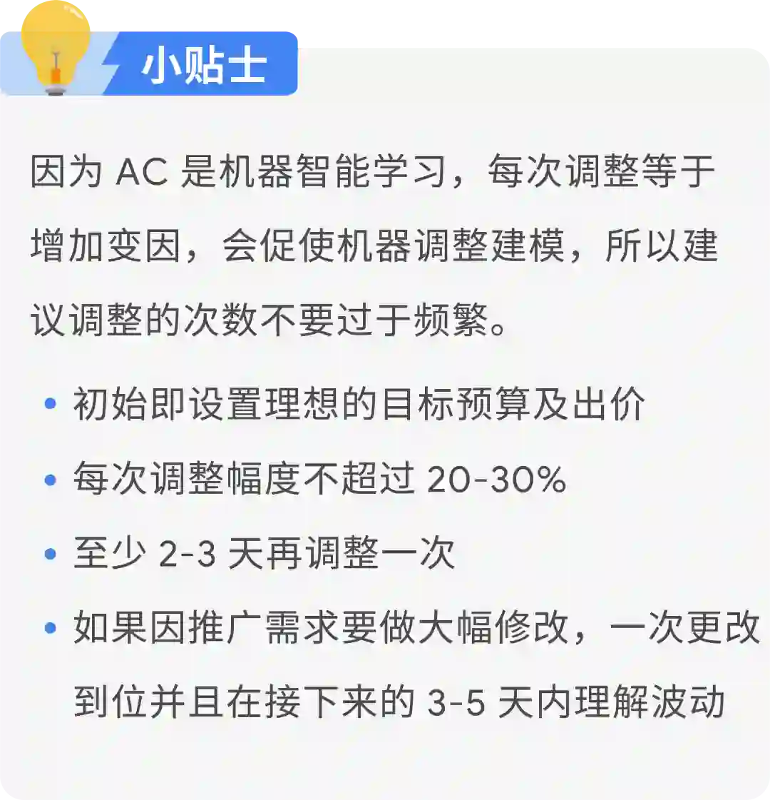 若已满足买量级推广需求,建议可以尝试逐步小幅降低出价,每 3 天以上调整一次幅度小于 10%。但是基于国内开发者常出海的市场都是高价值的存量市场,有机会拿量还是要千万把握