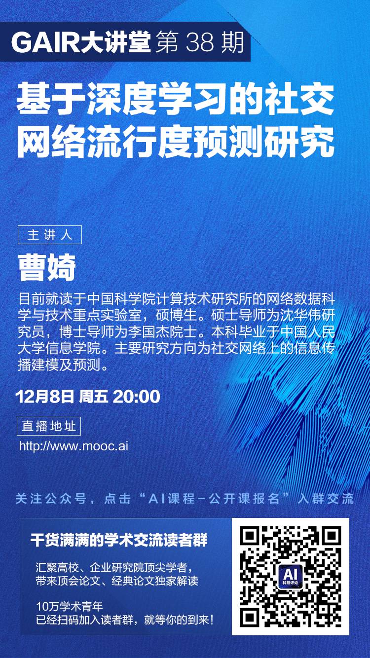 随着诸如 Twitter、Facebook、新浪微博等社交平台的兴起,每天有成千上万的消息在这些平台上产生并传播。在如此大体量的消息中,我们如何能提前预测出这些消息未来的关注转发量(流行度),对于用户和平台而言都具有很大的意义。因此,本次公开课将围绕社交网络上的消息流行度预测问题进行展开,并针对现状,提出了一种基于深度学习技术的端到端流行度预测框架(DeepHawkes 模型)。该工作已被国际会议 CIKM 2017 录用并发表,对应的论文题目为《DeepHawkes: Bridging the Gap between Prediction and Understanding of Information Cascades》。