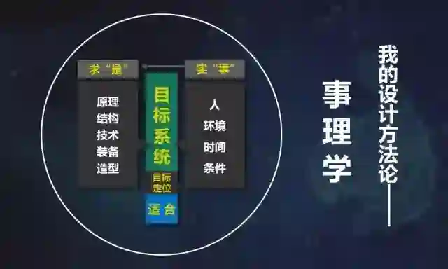 而改革开放以后,中国的设计很多只是讲原理、结构、工艺、造型,就是不讲事情。而真正的精华是在研究,把事情弄清了就能创造出西方没有的办法,解决中国的问题不一定要跟着西方的老路走,这就是事理学的核心,研究外因,然后去选择组织内因,甚至于给内因出题目。一个是目标要抽象出来,再一个把目标描述清楚,研究外部因素,外部弄透了再去组织内因。设计不在设计之里,真正的大设计是在设计之外,研究生活,研究条件,研究限制,这个思维方法是我们祖先造就的。