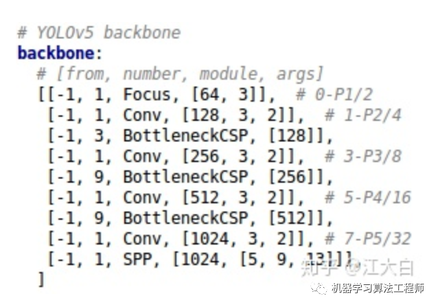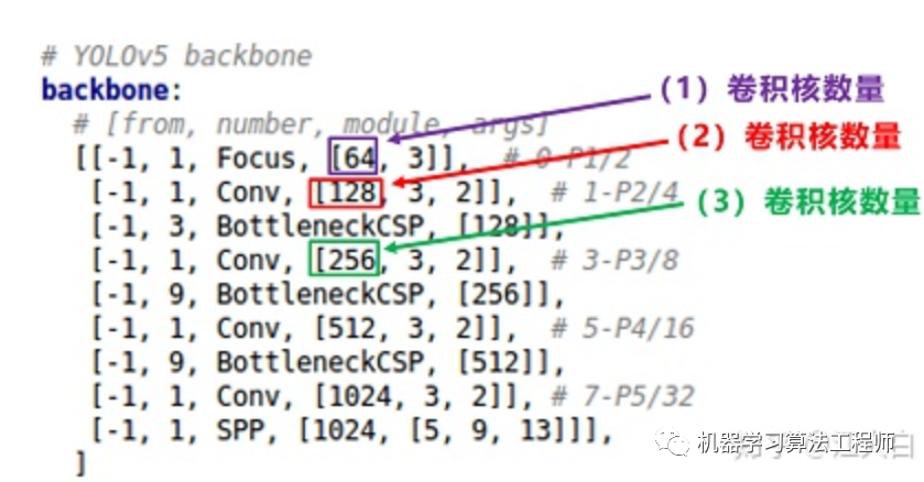按照上面Backbone的信息,我们知道Focus中,标准的c2=64,而gw=0.5,代入(2)中的计算公式,最后的结果=32。即Yolov5s的Focus结构中,卷积下采样操作的卷积核数量为32个。