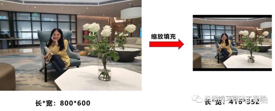 比如Yolo算法中常用416*416,608*608等尺寸,比如对下面800*600的图像进行缩放。