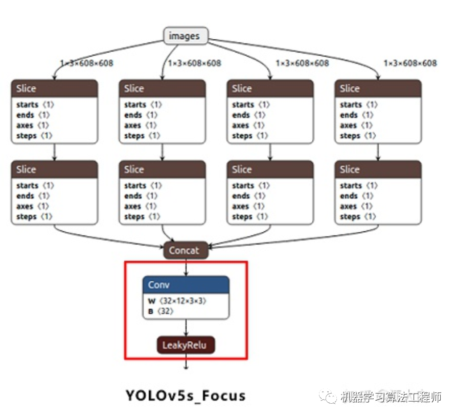 a.以Yolov5s结构为例,第一个Focus结构中,最后卷积操作时,卷积核的数量是32个,因此经过Focus结构,特征图的大小变成304*304*32。