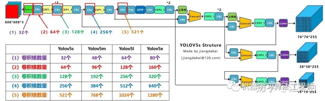 另外的三个卷积下采样操作,以及yolov5m,yolov5x结构也是同样的计算方式,大白这里不过多解释。
