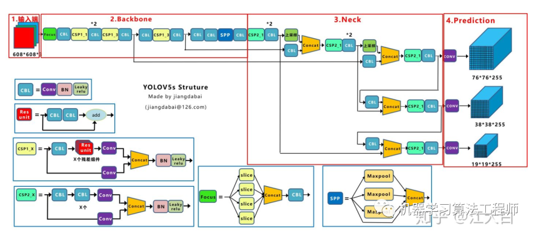 上图即Yolov5的网络结构图,可以看出,还是分为输入端、Backbone、Neck、Prediction四个部分。