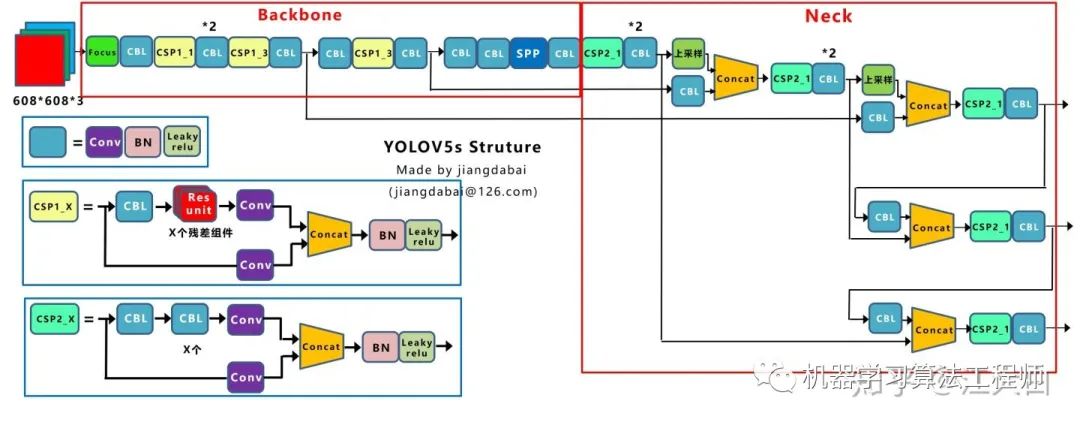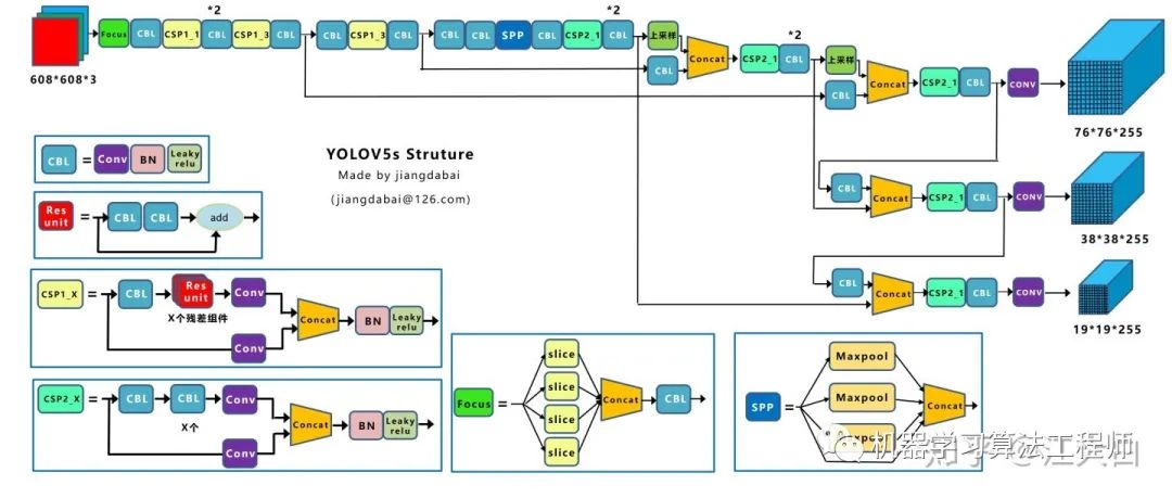 这里大白也和之前讲解Yolov3&Yolov4同样的方式,绘制了Yolov5s整体的网络结构图,配合netron的可视化网络结构查看,脑海中的架构会更加清晰。