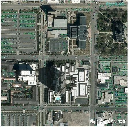 再使用分割的方式,将大图先分割成小图,再对每个小图检测,可以看出中间区域很多的汽车都被检测出来: